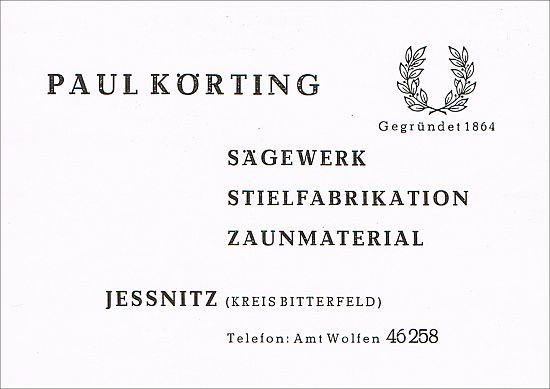 Founded in 1864 the Paul Körting sawmill & timber merchant (Sägewerk & Holzhandlung) was in business until 1989. Although the business was healthy two political system changes in Germany forced the family Körting to stop the business eventually.